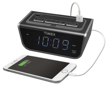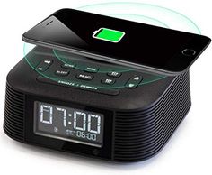 Bluetooth Stereo Dual Alarm Clock with Speakerphone, Wireless Charging and 1 Amp USB Charging Port. Stream audio wirelessly via Bluetooth from your mobile device. Dual alarm for separate wake times. Qi-certifi ed wireless charging pad on cabinet top to charge compatible devices. Automatic clock adjust via connected Bluetooth device.