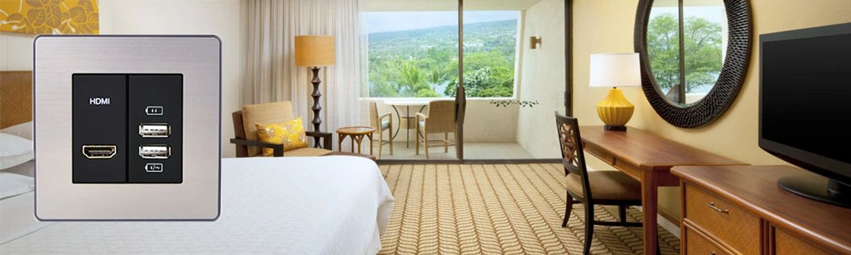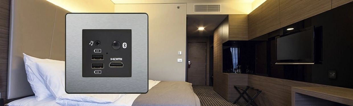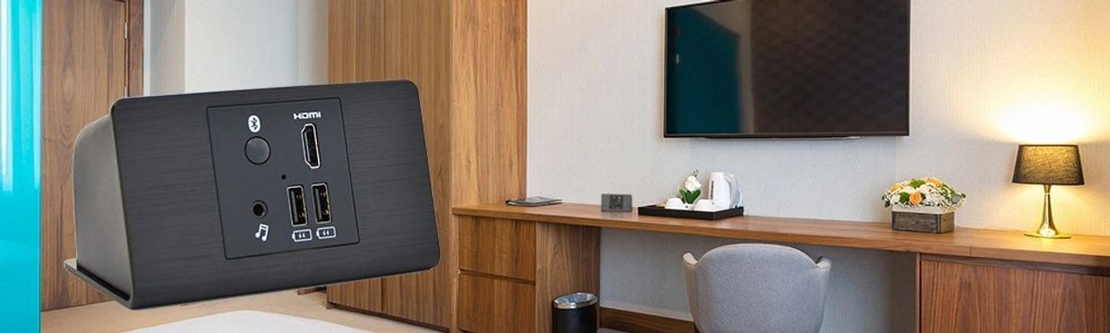 MediaHub range includes sockets for USB charging & A/V. The smallest and most powerful mobile device to TV connectivity panel on the market today. The focus is on simplicity, providing guests with the most important, and universally accepted mobile connections to charge and play (USB and HDMI). It offers USB charging for mobile